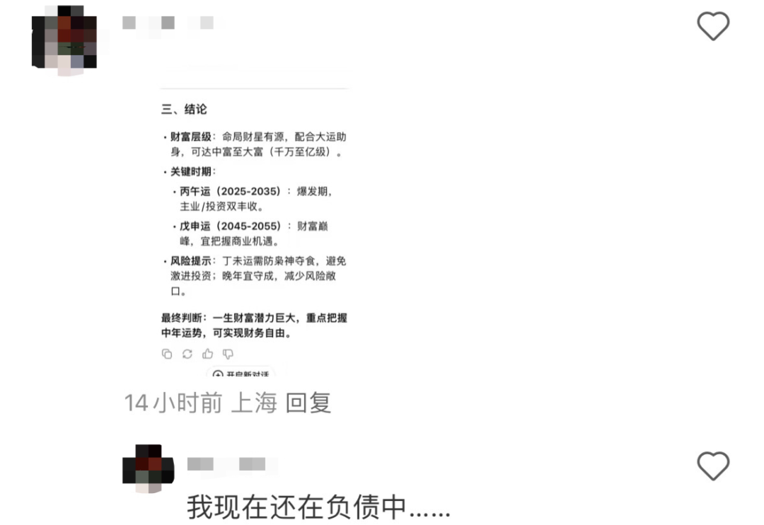 小红书上不少网友也像我一样,大半夜的不睡觉,在 DeepSeek 上沉迷玄学无法自拔,算八字、测星座,甚至还玩起了解梦、起名。