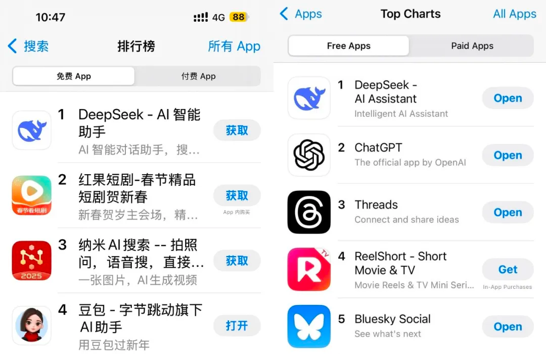1 月 27 日,DeepSeek 同时登顶中国区和美国区苹果 AppStore 免费榜。