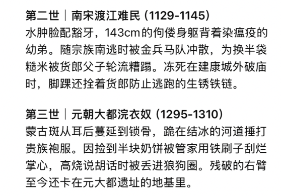有网友在 DeepSeek 上测出的每一世都像是「被命运嚼过的甘蔗渣」,不是南宋难民就是元朝浣衣奴,一世比一世命途多舛。