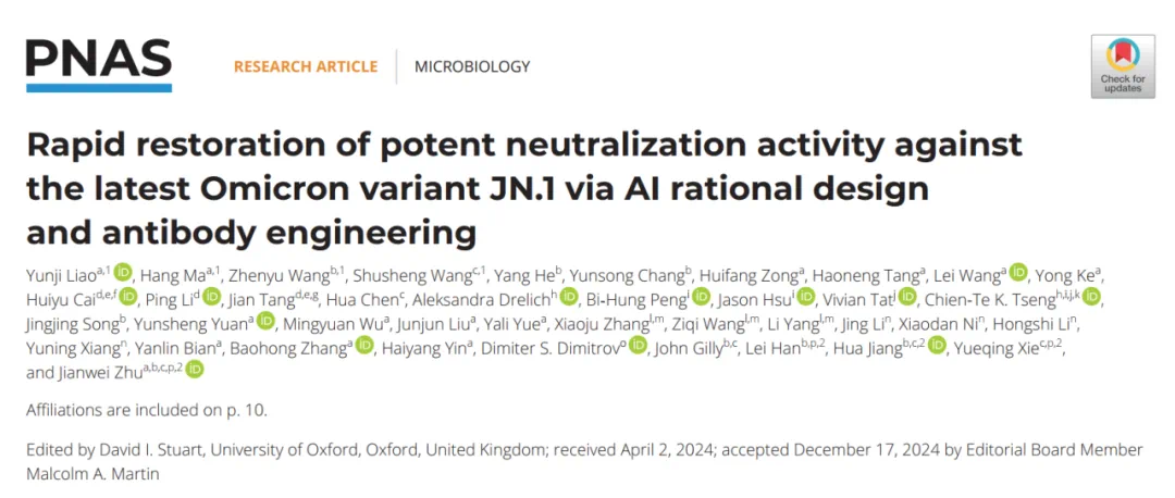 【1】Y. Liao, H. Ma, Z. Wang, S. Wang, Y. He, Y. Chang, H. Zong, H. Tang, L. Wang, Y. Ke, H. Cai, P. Li, J. Tang, H. Chen, A. Drelich, B. Peng, J. Hsu, V. Tat, C.K. Tseng, J. Song, Y. Yuan, M. Wu, J. Liu, Y. Yue, X. Zhang, Z. Wang, L. Yang, J. Li, X. Ni, H. Li, Y. Xiang, Y. Bian, B. Zhang, H. Yin, D.S. Dimitrov, J. Gilly, L. Han, H. Jiang, Y. Xie, & J. Zhu, Rapid restoration of potent neutralization activity against the latest Omicron variant JN.1 via AI rational design and antibody engineering, Proc. Natl. Acad. Sci. U.S.A. 122 (6) e2406659122, https://doi.org/10.1073/pnas.2406659122 (2025).