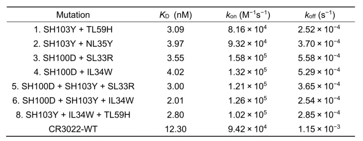 各 CR3022 突变体对 Omicron Spike 的 BLI 实验结果