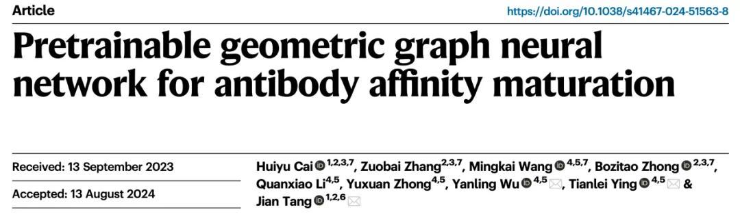 【2】Cai, H., Zhang, Z., Wang, M. et al. Pretrainable geometric graph neural network for antibody affinity maturation. Nat Commun 15, 7785 (2024). https://doi.org/10.1038/s41467-024-51563-8