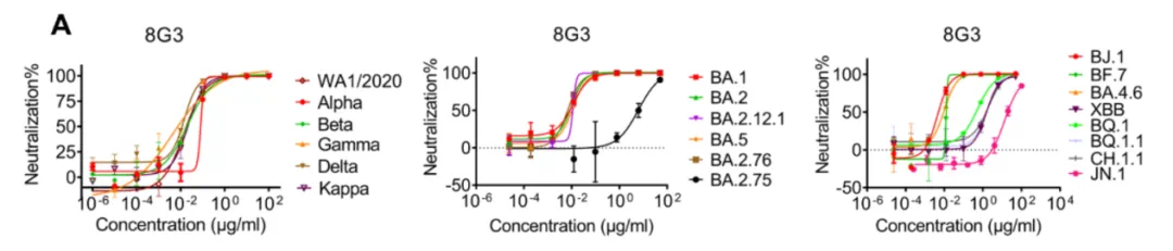 8G3 抗体是朱建伟团队从早期康复者体内筛选出的广谱中和抗体,在 BA.1 及多个变异株(Alpha、Beta、Gamma、Delta、Kappa、BA.1、BA.2、BA.5)中均展现出良好的中和能力。然而,面对更晚出现的 BA.2.75 及其后续毒株,8G3 的中和能力明显下降。针对最新的 JN.1 变异株(2023 年 8 月首次发现,现仍被 WHO 列为需关注变异株 VOC),其中和能力跌至原始水平的千分之一,几乎完全失效。