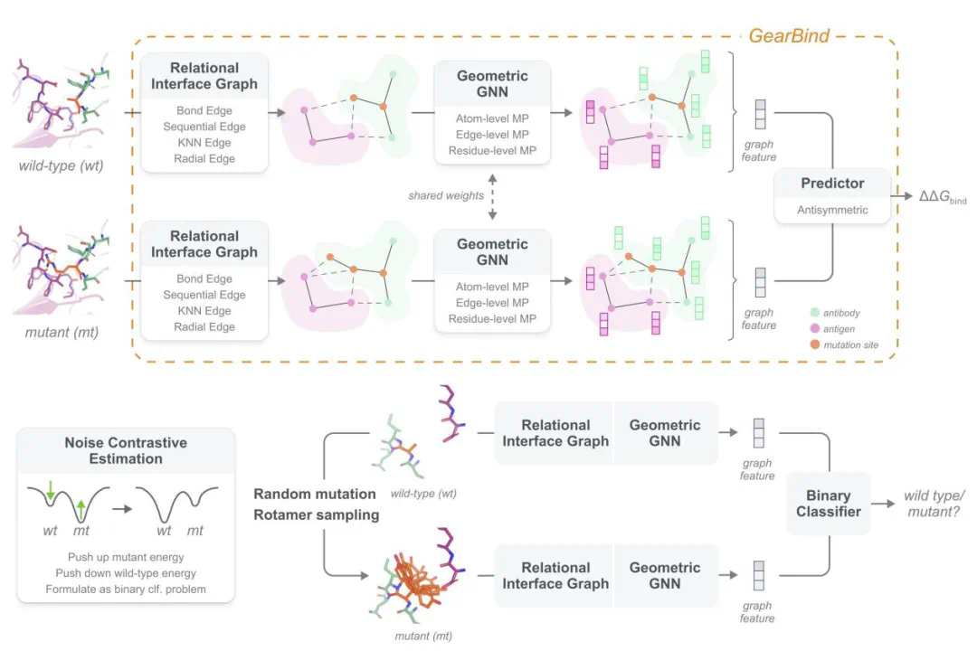 (上)GearBind 几何神经网络架构图(下)GearBind 预训练流程图