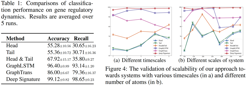 从上表可以看到 Deep Signature 在所有评测指标上均优于基线方法,右图分别对比了不同方法在模拟时间增加和系统规模扩大的表现,Deep Signature 在这两种实验场景均表现非常稳定。