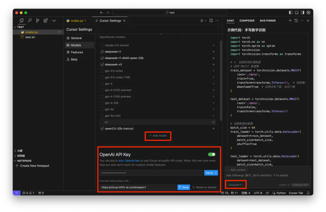 在设置中选择 Models 页面,找到 OpenAI API Key 模块。填写在无问芯穹大模型服务平台获取的 API Key 密钥,并将 Base URL 配置为 https://cloud.infini-ai.com/maas/v1