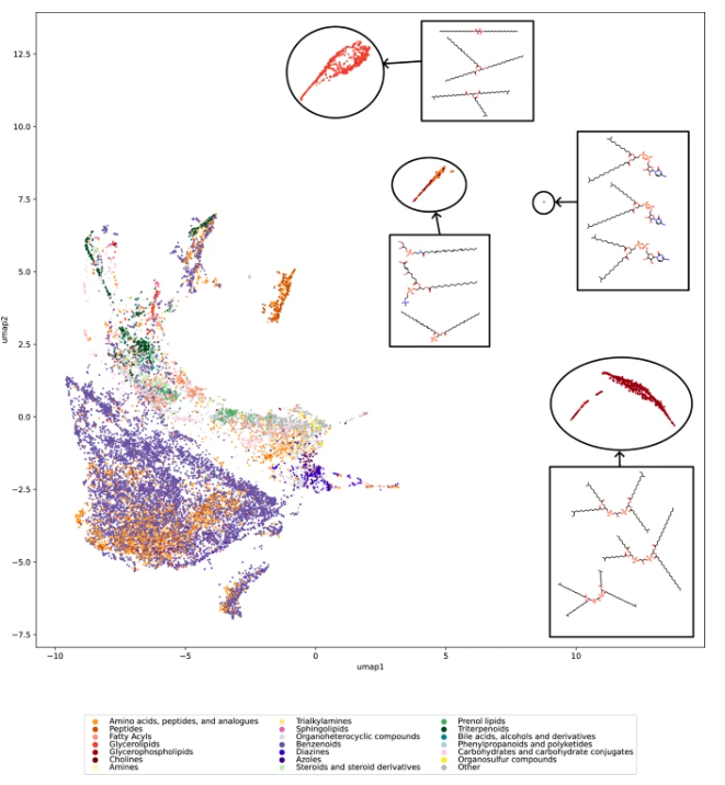 某些分子结构和化合物类别,特别是某些脂质类别,会导致 UMAP 嵌入中出现异常值簇。团队表示必须要高度谨慎地从 2 维 UMAP 嵌入中推断数据的结构。