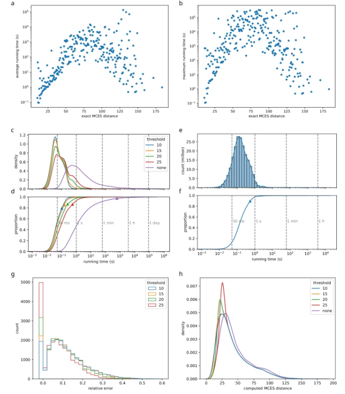 首先考虑 ILP 运行时间对确切 MCES 距离的依赖性,其次评估边界和精确计算的组合如何产生有利的运行时间。为了通过子采样排除偏差,团队使用 19,994 个生物分子结构中的所有对重复了上述分析。最后对计算边界的误差进行分析。