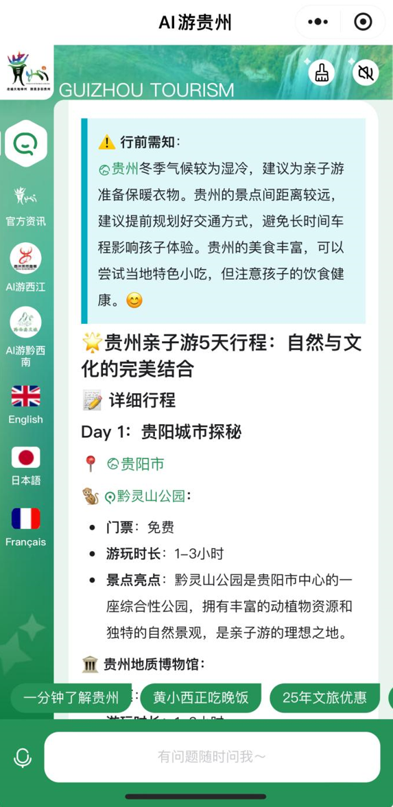 以规划 “5 天贵州亲子游” 为例,“AI 游贵州” 会首先分析亲子用户对安全性、趣味性的需求,接着筛选黄果树瀑布、西江千户苗寨等适龄景点,再根据景点间距自动计算并罗列出行车或公共交通时间,生成劳逸结合的行程表,并针对冬季当地气候特点给出穿衣、饮食健康等贴心提示。