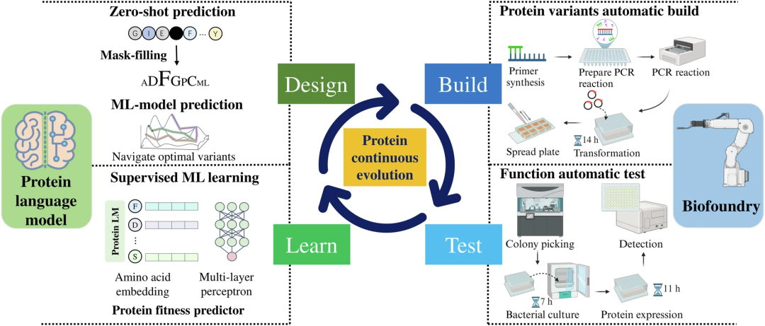 浙江大学的研究人员设计了一个基于蛋白质语言模型的自动进化平台,这是一个在设计-构建-测试-学习循环内实现蛋白质工程自动化的闭环系统。
