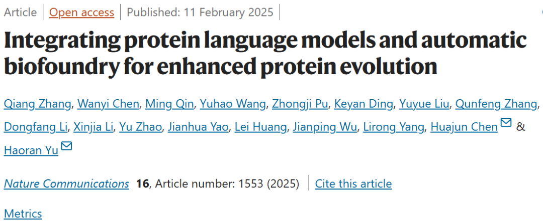 该研究以「Integrating protein language models and automatic biofoundry for enhanced protein evolution」为题,于 2025 年 2 月 11 日发布在《Nature Communications》。