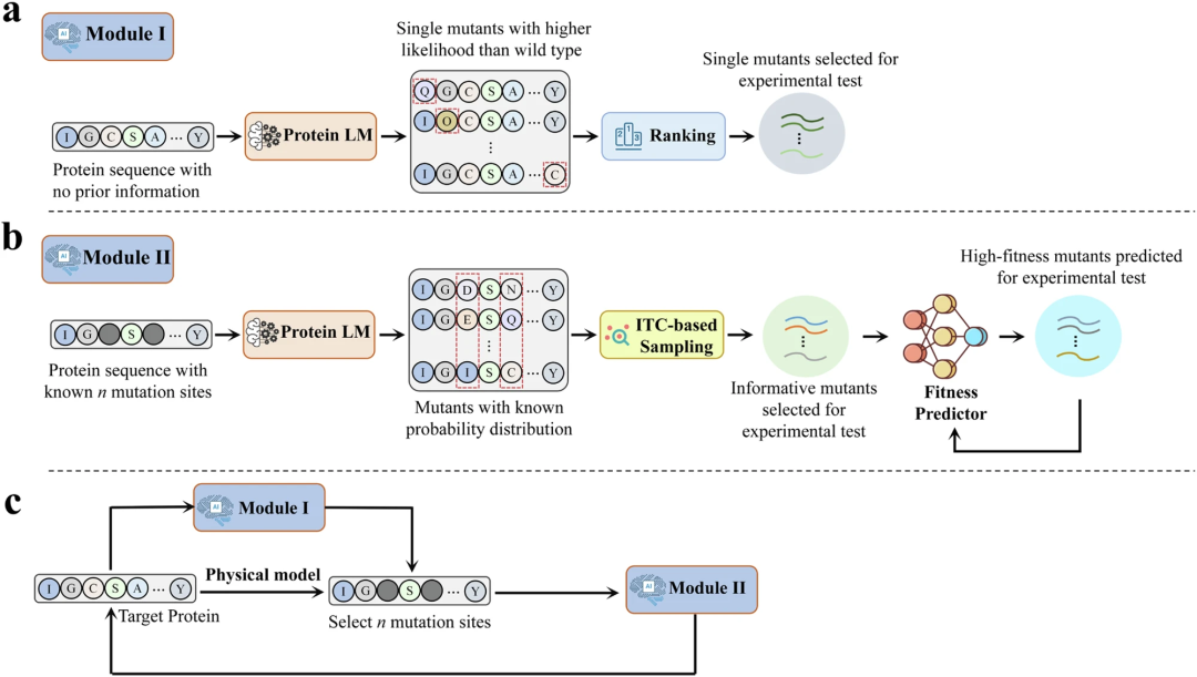 另一方面,模块 II 针对具有已知突变位点的蛋白质,并使用 PLM 来抽取有用的突变体进行实验表征。此外,PLM 用于编码蛋白质序列以训练适应度预测器。模块 I 和模块 II 可以组合使用或独立使用。