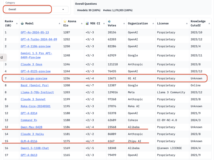LMSYS 总榜排名 2024.5.21