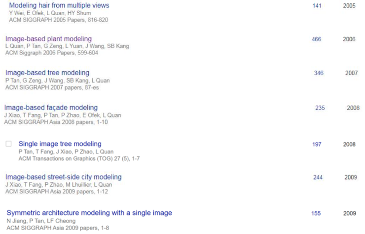 2005 年,港科大视觉实验室关于 IBM 的第一个工作发表在计算机图形学顶会 SIGGRAPH 上,建模对象是头发。2006 年,权龙团队又发表了围绕植物的建模,2007 年、2008 年、2009 年实验室的 IBM 工作也相继中了 SIGGRAPH,建模对象也从头发、植物升级到建筑、街道与城市。