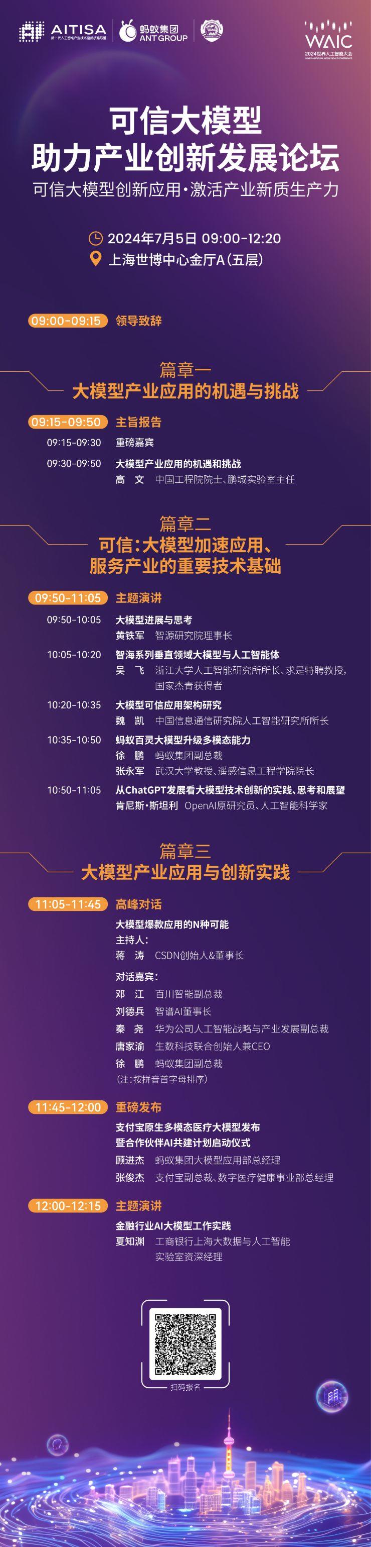 由世界人工智能大会组委会办公室指导,新一代人工智能产业技术创新战略联盟(AITISA)主办,蚂蚁集团承办的“可信大模型助力产业创新发展论坛”,将于7月5日在上海·世博中心金厅举行。