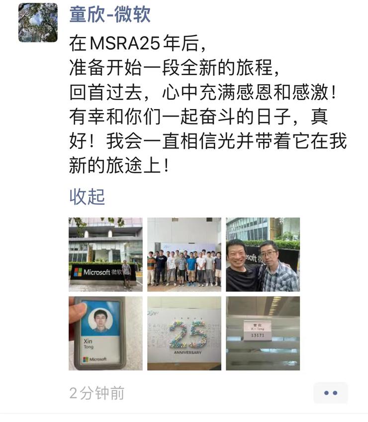 微软全球合伙人、微软亚洲研究院首席研究员童欣离职:据悉,童欣于 1993 年和 1996 年获得浙江大学本科和硕士学位,1999 年从清华大学博士毕业后加入微软亚洲研究院。同时担任中国科学技术大学兼职教授,博士生导师。童欣的主要研究方向是计算机图形学和计算机视觉。作为微软亚洲研究院网络图形组首席研究员,他在微软从事图形学研究25 年。