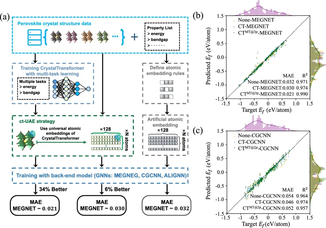 在应用 ct-UAE 预测混合钙钛矿数据库中的形成能后,该团队实现了准确度的提高,MEGNET 提高了 34%,CGCNN 提高了 16%,展示了它们作为原子指纹解决数据稀缺挑战的潜力。