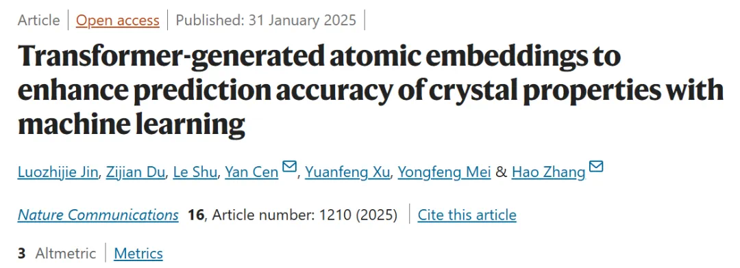 该研究以「Transformer-generated atomic embeddings to enhance prediction accuracy of crystal properties with machine learning」为题,于 2025 年 1 月 31 日发布在《Nature Communications》。