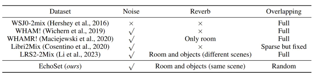 现有的语音分离数据集往往与真实世界的声学环境存在较大差距,导致模型在实际应用中的泛化能力不足。为了更真实地模拟复杂声学环境中的语音分离任务,研究团队提出了 EchoSet 数据集,该数据集不仅包含噪声,还模拟了真实的混响效果(如考虑物体遮挡和材料特性),并且说话人之间语音重叠比例是随机的。