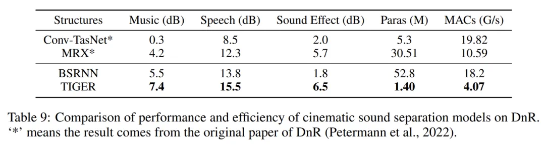 此外,TIGER 在电影音频分离任务中也表现出了强大的泛化能力。实验结果显示,TIGER 在分离电影音频中的语音、音乐和音效时,在保持轻量的情况下,性能显著优于其他模型,进一步验证了其在复杂声学环境中的适用性。