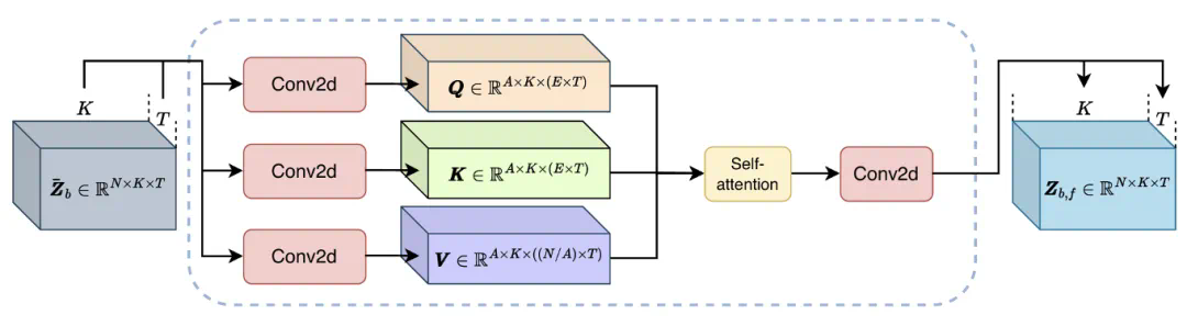 为了捕捉长距离依赖关系,TIGER 采用了全 / 频帧注意力模块(F³A)。同样以频率路径为例,首先采用二维卷积将输入特征转换为查询(Query)、键(Key)和值(Value),然后将特征维度和时间维度合并,得到每个频带对应的全帧信息。