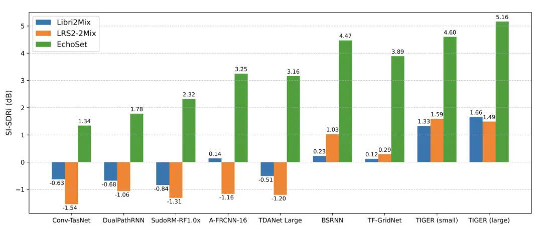 为了解决这些问题,清华大学的研究团队设计了一种名为 TIGER(Time-frequency Interleaved Gain Extraction and Reconstruction network)的轻量级语音分离模型,并提出了一个新的数据集 EchoSet,旨在更真实地模拟复杂声学环境中的语音分离任务。