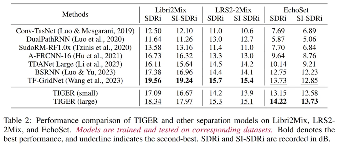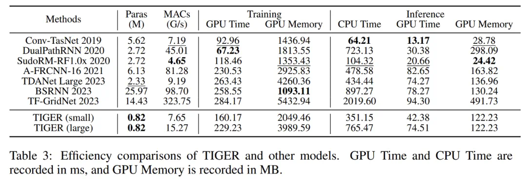 实验结果表明,TIGER 在压缩 94.3% 参数量和 95.3% 计算量的同时,性能与当前最先进的模型 TF-GridNet [1] 相当。