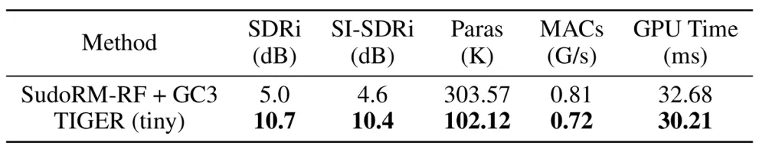 SudoRM-RF + GC3 与 TIGER (tiny) 的性能和效率比较