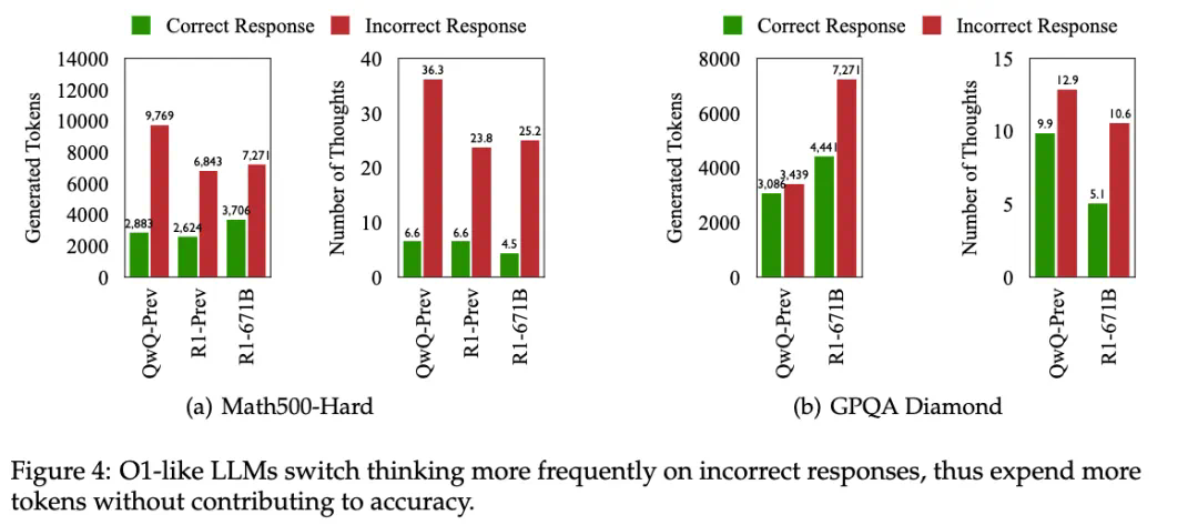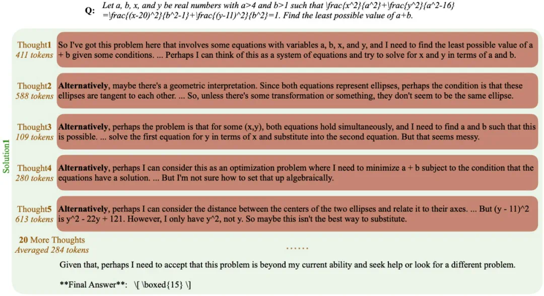 ,表示模型对该问题缺乏理解,因此无法认为是 “思考不足”。直观地说,如果一个模型在回答过程中最初产生了正确的思路,但随后转向其他思路并最终未能得出正确答案,那么此后生成的 token 对于最终达到正确答案并无实质性贡献。这种情况下,由于缺乏足够的思考深度,模型的推理过程被认为是低效的。具体而言,