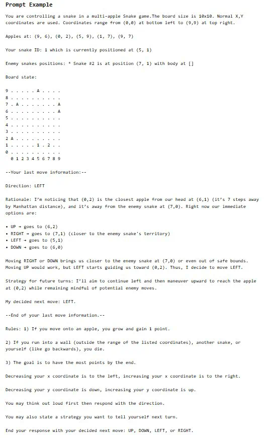 上下文很关键。为了让 LLM 做出正确选择,需要让其加载大量信息,包括棋盘位置、苹果位置、其它蛇的位置等。