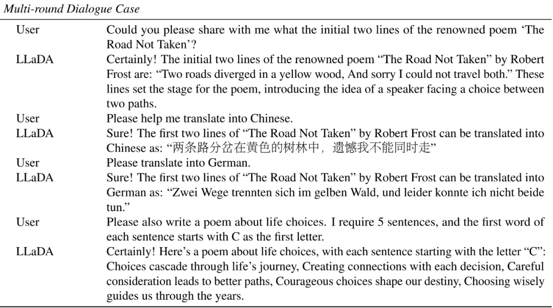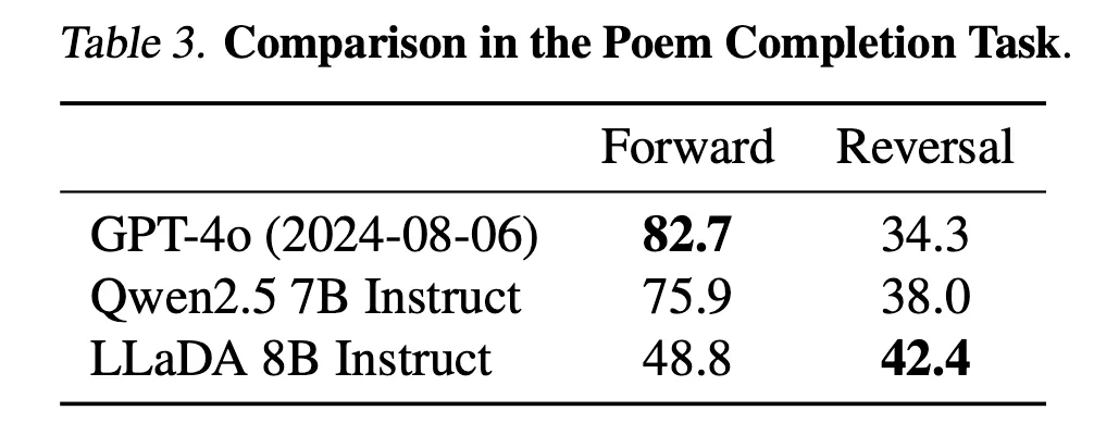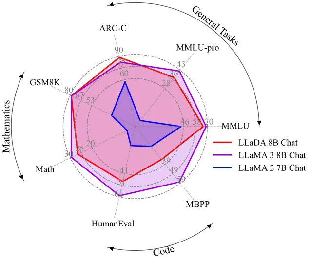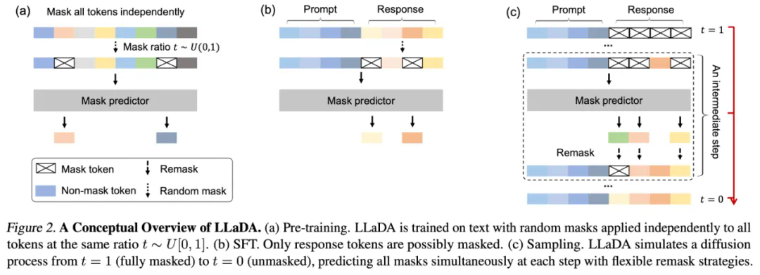 中不放回地均匀采样 l 个 token 进行掩码得到。扩散语言模型 LLaDA 首次展示了通过前向掩码加噪与反向去噪机制,同样可以实现大语言模型的核心能力。实验表明,LLaDA 在可扩展性、上下文学习和指令遵循等方面表现优异,具备与传统自回归模型相媲美甚至更优的性能,同时其双向生成与增强的鲁棒性有效突破了自回归建模的固有限制,从而挑战了「大语言模型的智能必然依赖自回归生成」的传统观念。