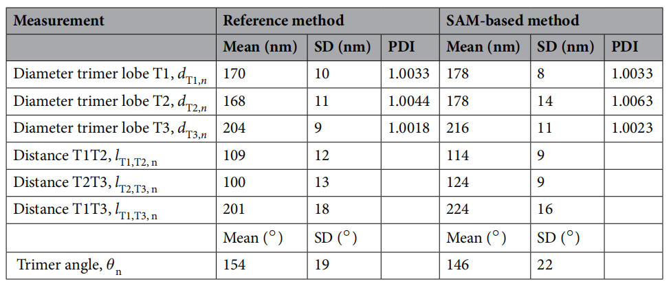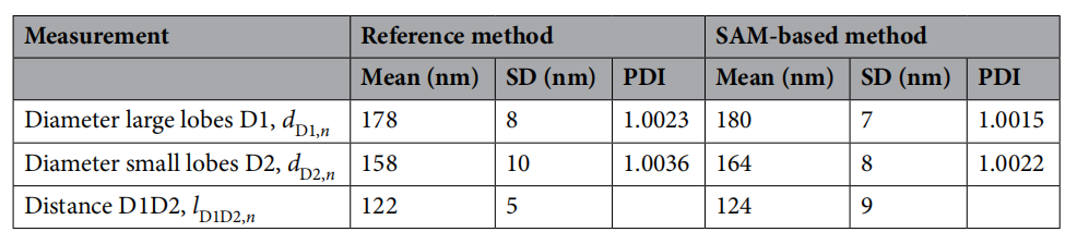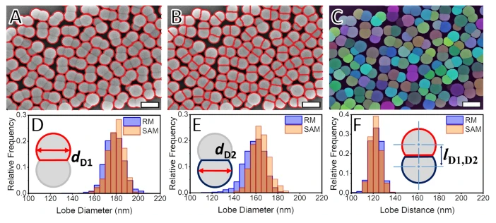哑铃形(DiPS)颗粒:SAM 准确分割双瓣结构,测得大瓣(D1)与小瓣(D2)直径分别为 180 nm 和 164 nm,与 RM 结果高度吻合(偏差 <4%),瓣间距(lD1D2)误差仅 1.6%。