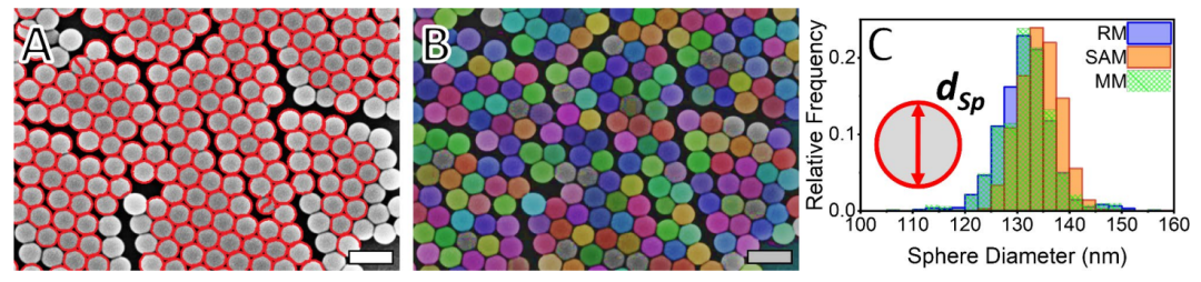 研究团队选取纳米球(SphPS)、哑铃形(DiPS)和三聚体(TriPS)三类模型颗粒进行验证。对比手动测量(MM)、分水岭参考方法(RM)和 SAM 方法发现: