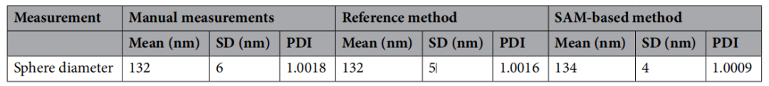 纳米球(SphPS)分析:SAM 的直径测量均值(134 nm)与手动测量(132 nm)偏差 <2%,且分布更集中(PDI=1.0009 vs 1.0018),证明其分割一致性更优。