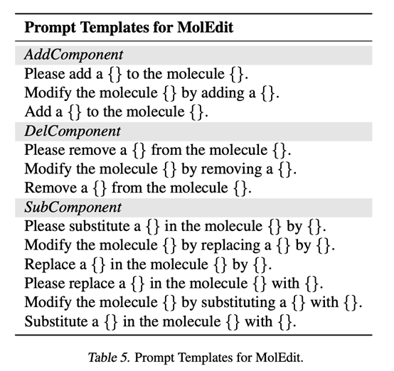AddComponent, DelComponent, SubComponent (MolEdit): 指令 LLM 对分子进行添加、删除或替换官能团的操作。