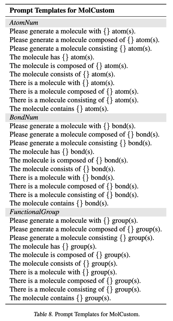 OpenMolIns 数据集包含九个子任务的指令和对应的目标分子结构: