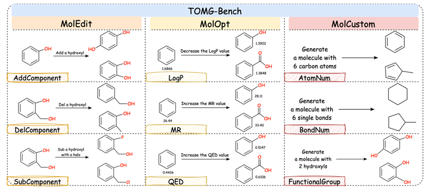 TOMG-Bench 是第一个用于评估大型语言模型 (LLM) 开放域分子生成能力的基准。其包含一个数据集,包含三个主要任务:分子编辑 (MolEdit)、分子优化 (MolOpt) 和定制分子生成 (MolCustom)。