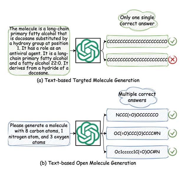 图 1:对比基于文本的目标导向的分子生成 (a) 和开放式分子生成 (b)