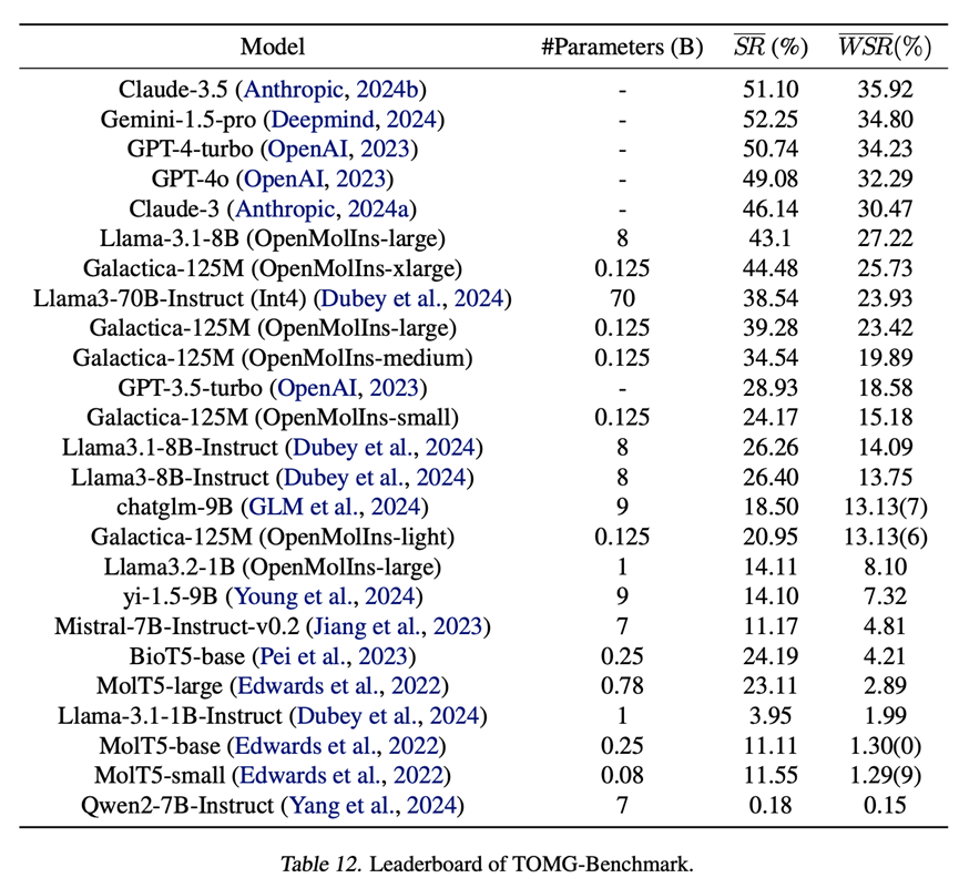 TOMG-Bench 的实验结果揭示了 LLM 在分子发现领域开放域生成能力的一些重要发现: