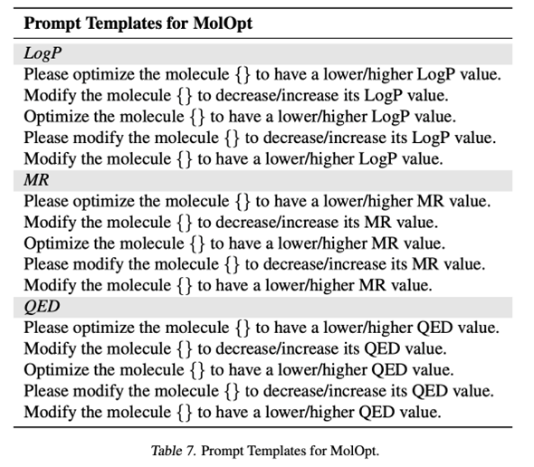 LogP, MR, QED (MolOpt): 指令 LLM 优化分子的 LogP、MR 或 QED 值。