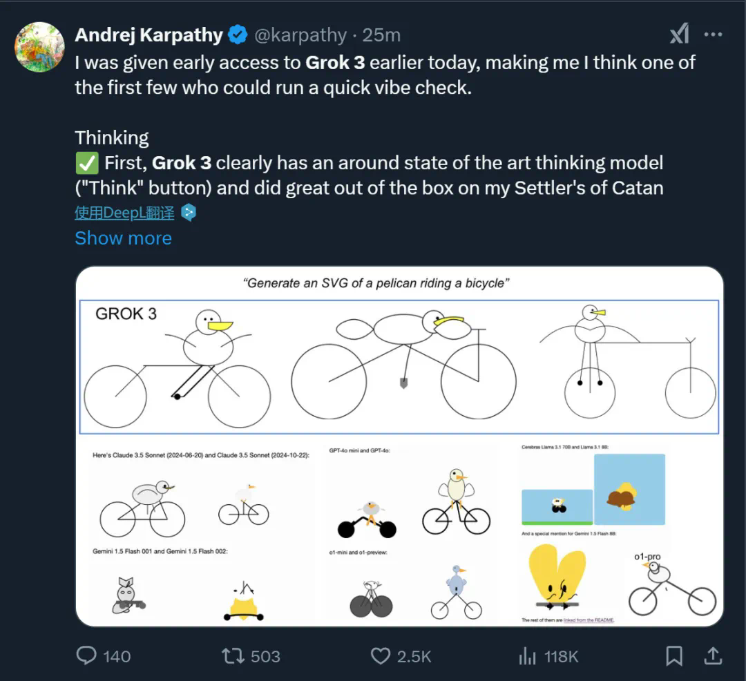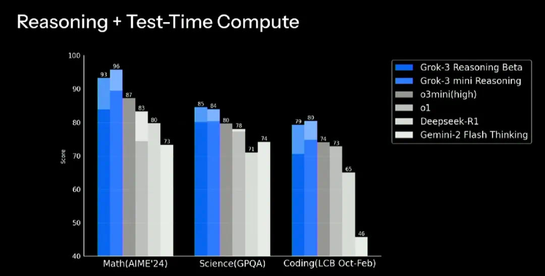 Grok-3 + Thinking 的水平接近 OpenAI 最强模型(每月 200 美元的 o1-pro)的最先进水平,略优于 DeepSeek-R1 和 Gemini 2.0 Flash Thinking。 -