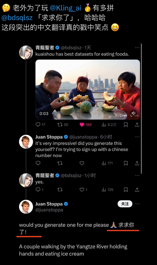 到目前为止,大部分国内初创的文生视频公司并没有拉开太大差距,风头都被国外的Sora、Runway占据之时,可灵AI是国内唯一被马斯克点赞的一个,可以说是十分争气。但其实,在马斯克亲自点赞之前,可灵AI的风早就已有吹遍国内外之势。6月初,快手自研的视频生成大模型可灵AI正式发布。问世之初,在海外社交媒体上就掀起了一波热度,大量海外网友在「求」一个可灵AI的内测机会。