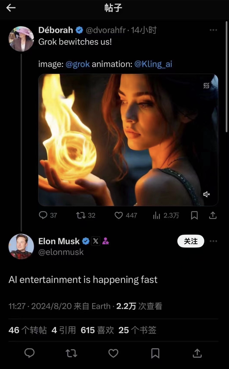 文章来源于互联网:可灵AI还是火到了马斯克那!