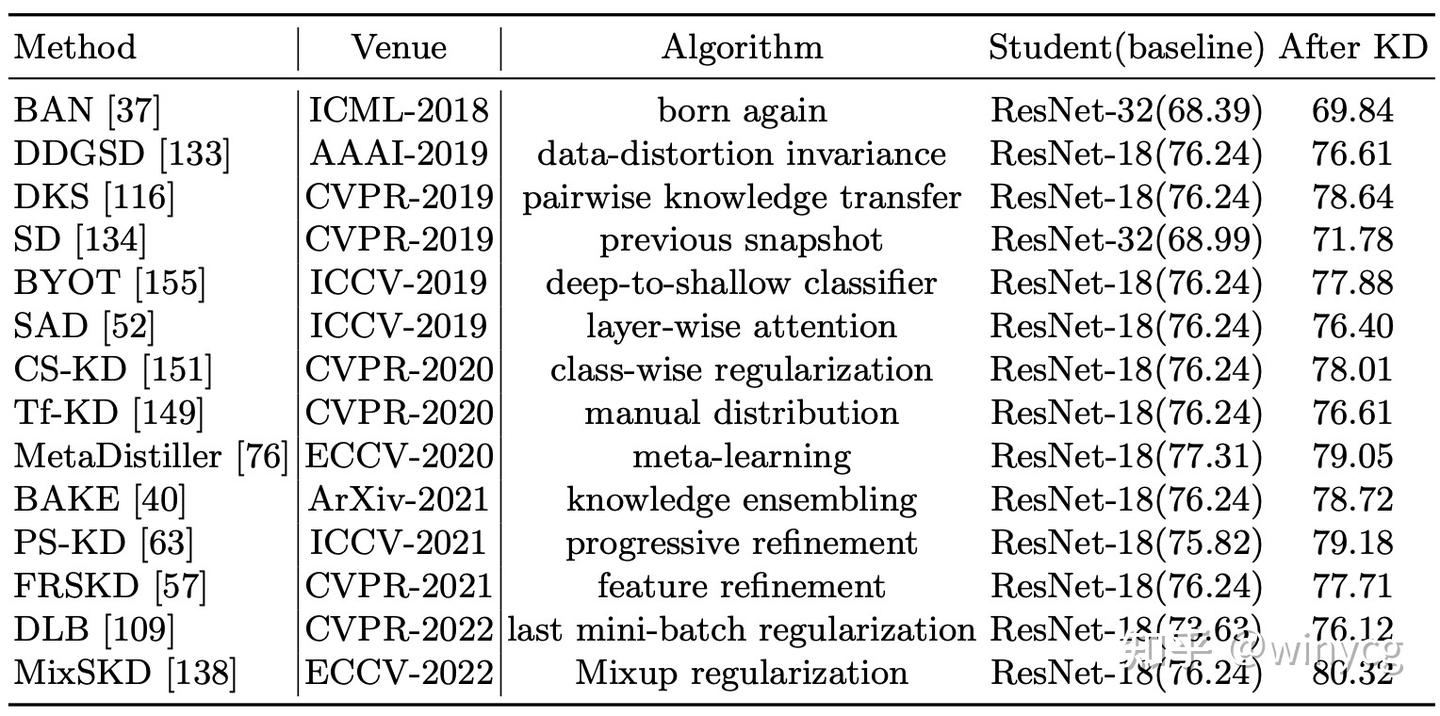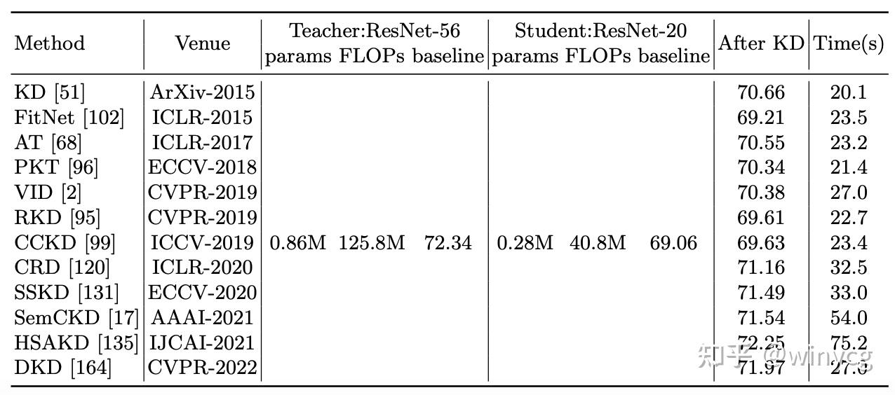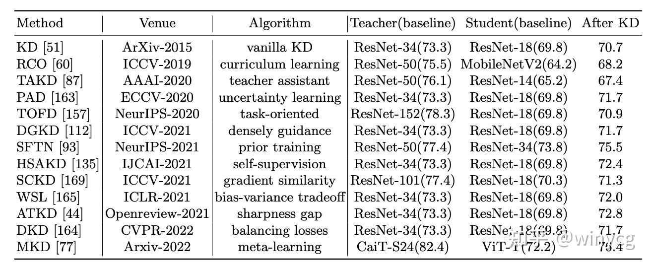 总结。我们在表2中对各种基于特征的KD方法进行了实验结果对比。一般来说,基于特征的KD是对基于响应的KD的全面补充,它提供了封装学习过程的中间特征。然而,简单地在教师和学生之间对齐相同的阶段性特征信息可能会导致负面监督,特别是在性能差距或架构差异较大的情况下。一个更有价值的方向可能是基于学生友好的特征KD,它提供了语义一致的监督。