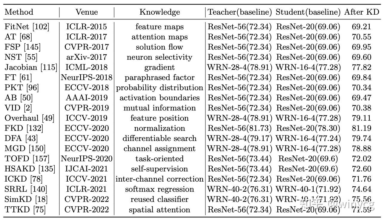 最近,TOFD和HSAKD将辅助分类器附加到由额外任务监督的中层特征图上,以产生信息丰富的概率分布。前者利用了原始的监督任务,而后者引入了有意义的自监督增强任务。MGD使用自适应通道分配算法执行细粒度特征提取。ICKD从包含特征空间多样性和同源性的特征图中挖掘通道间相关性。在通道维度之外,TTKD使用自注意力机制进行空间级特征匹配。总之,以前的方法通常会为KD提取更丰富的特征信息,从而获得比经典FitNet更好的性能。