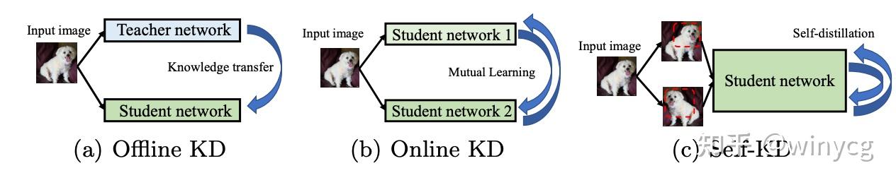 蒸馏机制通常分为离线知识蒸馏、在线知识蒸馏和自知识蒸馏,如图2所示: