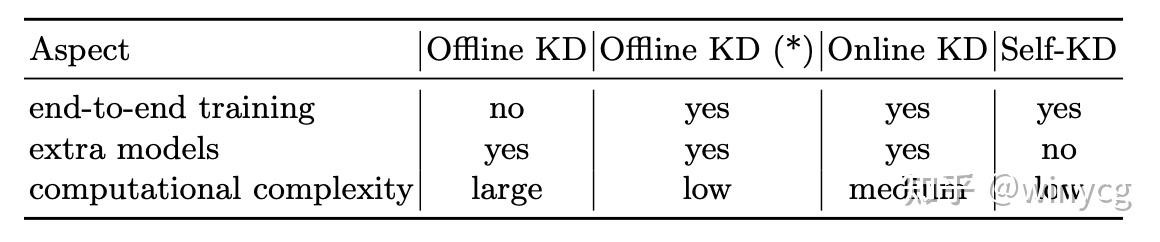 如表7所示,本文展示三种知识蒸馏方法在不同方面的比较。离线蒸馏需要一个额外的教师模型来训练学生,而在线蒸馏或自蒸馏通过端到端优化训练一组模型或单个模型。当公开可用的预训练教师模型不可用时,离线蒸馏需要预先训练一个高性能的教师网络,因此训练代价较高。自蒸馏利用单一模型实现自我提升,通常具有较低的计算复杂度。值得注意的是,离线蒸馏在预训练教师模型为公开模型时也具有较低的训练复杂性,因为训练过程中教师网络是不需要梯度传播训练的。