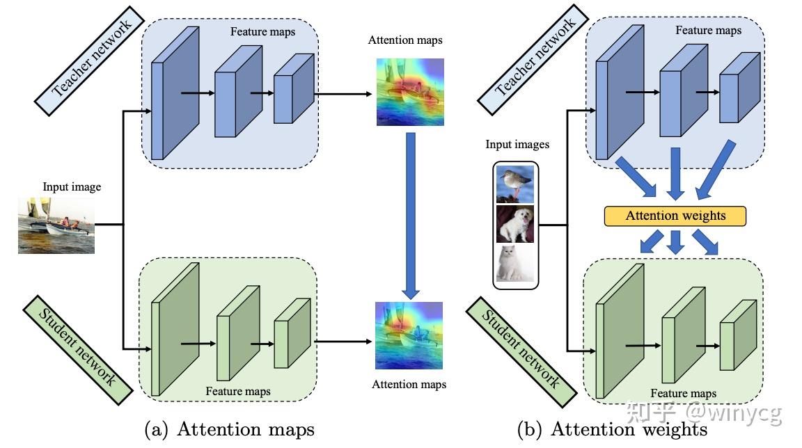 基于注意力的蒸馏利用注意力信息进行有效的知识转移。目前的工作遵循两条主线:(1)提取从特征图中提炼出的注意力图,以及(2)基于自注意力机制的加权提取,如下图6所示。