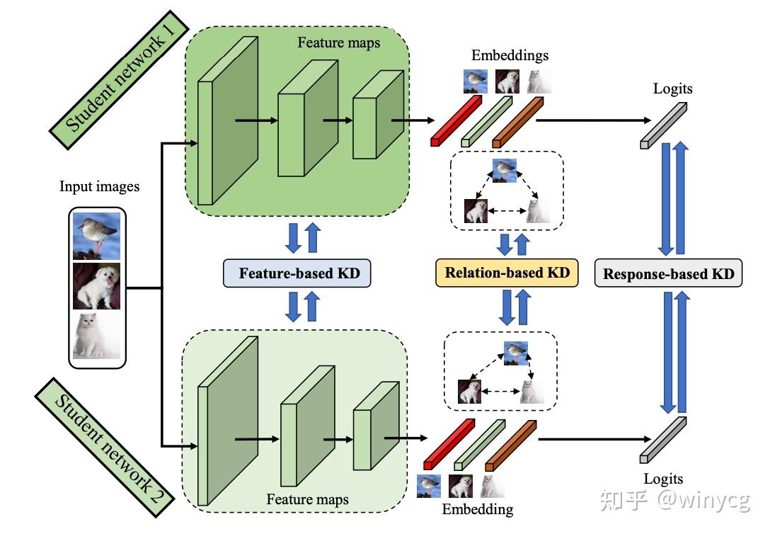 在线知识蒸馏按照迁移的知识类型分为基于响应、特征和关系的在线知识蒸馏: