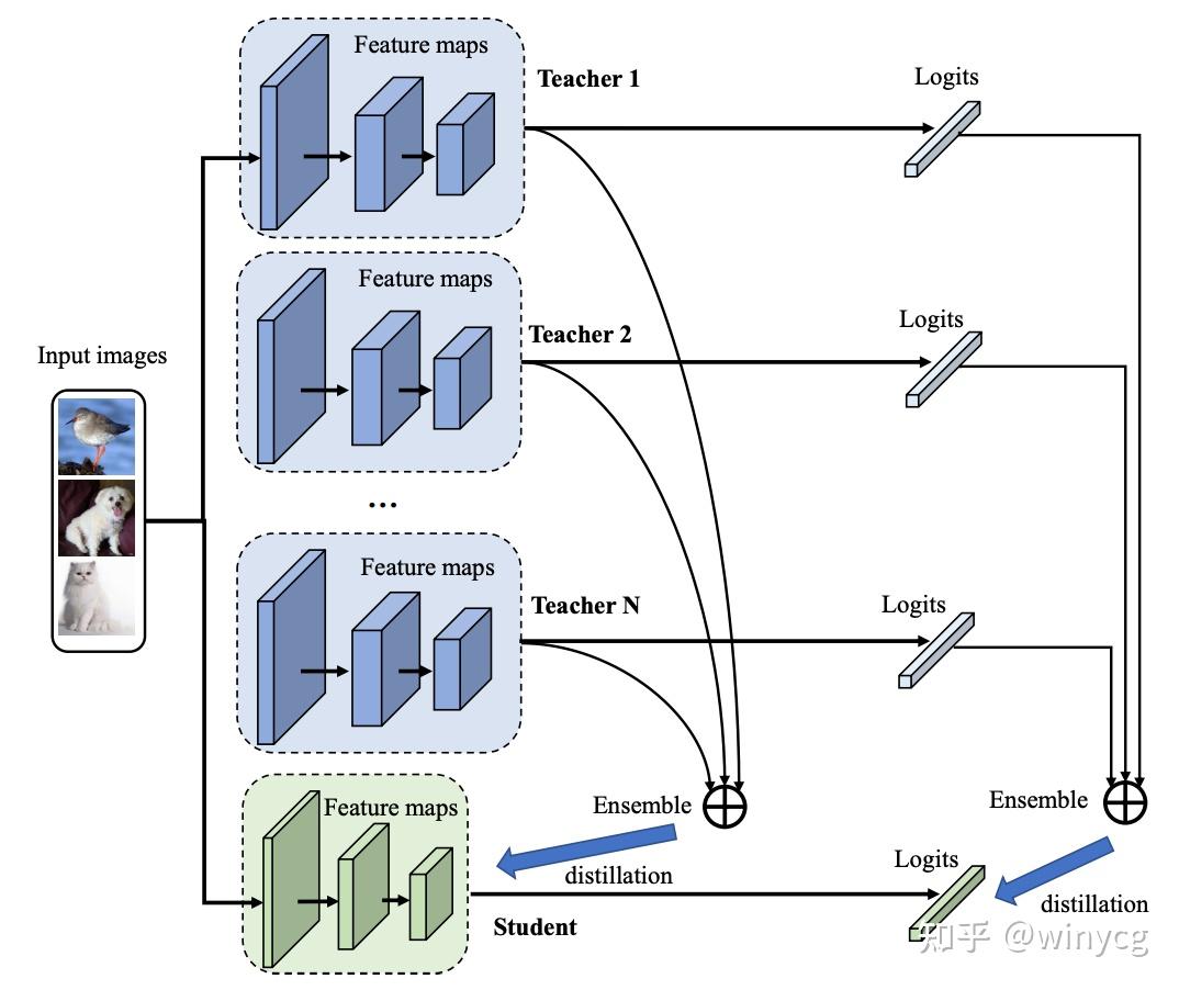 模型集成的逻辑分布是多教师知识蒸馏的直接方法之一。基于这一理念,引导学生学习教师集成逻辑的软输出。然而,对多教师的预测进行简单平均可能会忽视教师群体多样性。因此,一些工作提出了通过自适应地模仿教师的输出并使用各种聚合权重来学习学生模型。